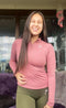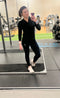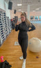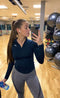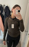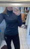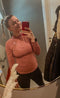 Esta é incrível! Detalhes ribeteados por toda parte. Fica confortável e é lisonjeiro. Não mostra manchas de suor no tecido. O tecido é muito elástico. Eu adoro que ela seja longa na cintura e nas mangas. Eu tenho a minha no tamanho pequeno e ela se ajusta perfeitamente em todas as áreas, exceto do pescoço até o ombro. A parte dos ombros é estreita. Mas sou bastante larga nas costas, e isso impacta o ajuste ali. Essa provavelmente será usada mais no dia a dia por causa do ajuste ao redor dos ombros, possivelmente em dias que treino pernas. Mas meu Deus, que suéter tão confortável para o dia a dia! 🙌🏾