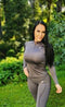 Esta parte de cima tem um material incrivelmente agradável e é muito confortável de usar. A única desvantagem é que, junto com uma legging de cintura alta e lisa, pode escorregar um pouco em direção à barriga (a menos que você tenha uma barriga chapada). Mas, no geral, o tecido é incrivelmente agradável e de boa qualidade. O guia de tamanhos é muito bom e você escolhe o tamanho que normalmente usa.